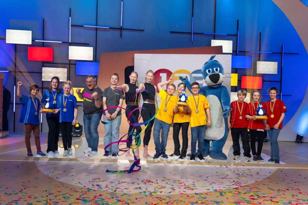 Im August wurde Emilia als Kandidatin für die Sendung „1, 2 oder 3“ ausgelost. Am 24.11.2025 tauschten Emilia, Max und Eva aus den Klassen 5a und 5b deshalb die Schule gegen ein Fernsehstudio. Gemeinsam mit ihren Familien reisten die drei zur Bavaria Filmstadt nach München. Die Aufregung war bei allen groß, denn der Beginn der Aufzeichnung wurde sehnsüchtig erwartet. Zunächst mussten jedoch die blauen T-Shirts des Teams Bayern angezogen, die Gesichter abgepudert und die Haare in der Maske gestylt werden. Nach einer erfolgreichen Proberunde lernten die Teams schließlich den Moderator Elton kennen, der ihnen das bis dahin geheime Thema der Sendung verriet. Anschließend ging es vor die Kameras, wo Fragen rund um das Thema „Zwillinge“ beantwortet werden mussten. Am Ende erreichte das Team gemeinsam mit den Mannschaften aus Sachsen und Niedersachsen einen Gleichstand von 16 Punkten. Neben dem Piet-Flosse-Pokal, Medaillen und Urkunden durften sich die Teilnehmenden außerdem über 320 Euro für die Klassenkassen freuen. Es war ein einmaliges Erlebnis, das sie so schnell nicht vergessen werden. Die Ausstrahlung der Sendung erfolgt am 28.12.2025 um 8:35 Uhr im ZDF sowie am 04.01.2026 im KiKA. (fs)
