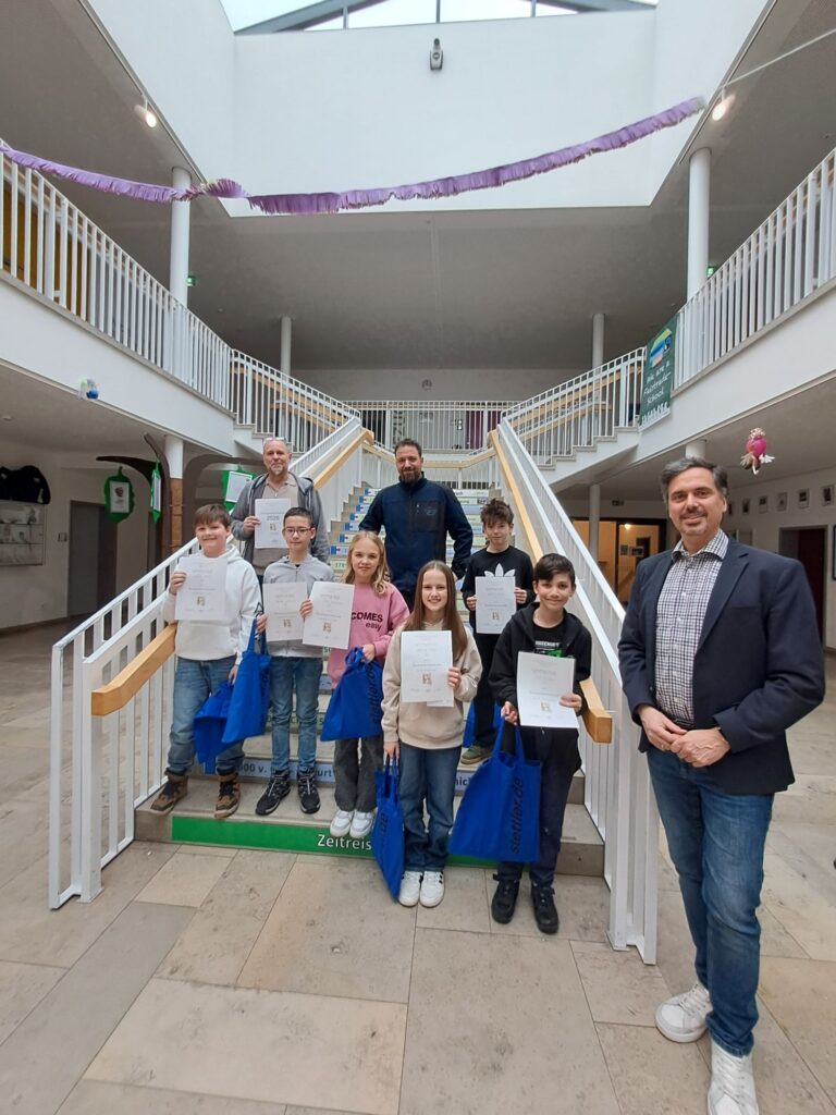Alle Teilnehmer erhielten eine Urkunde und eine Aufmerksamkeit, die unser Kooperationspartner Stettler Kunststofftechnik GmbH & Co. KG. aus Untersteinach beisteuerte. Den beiden Siegern und dem Zweitplatzierten Luis Schuster (5c) überreichte Ausbildungsleiter Manuel Vinzens ein Geldpräsent. Wir sagen dafür herzlich Danke. (sl)