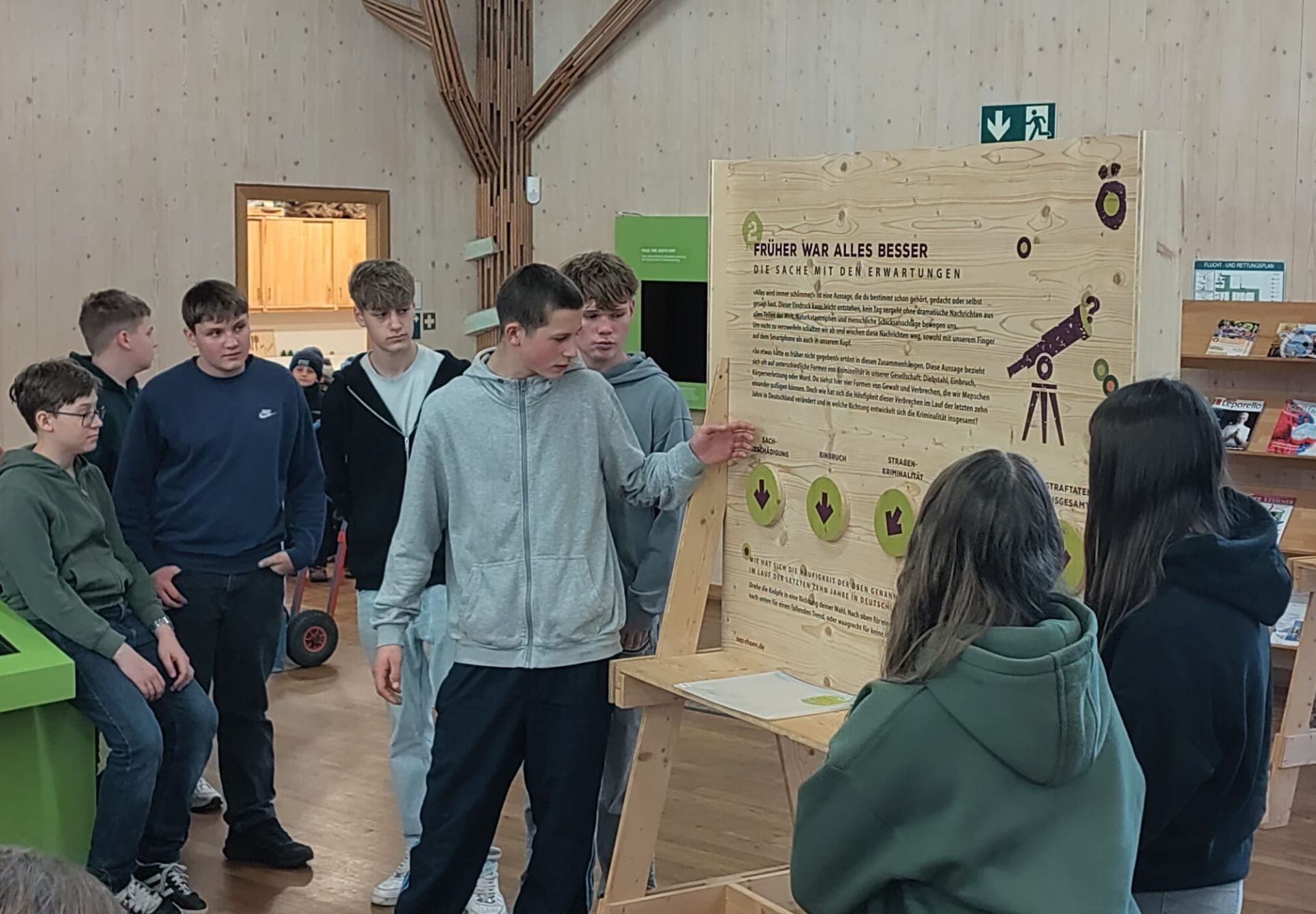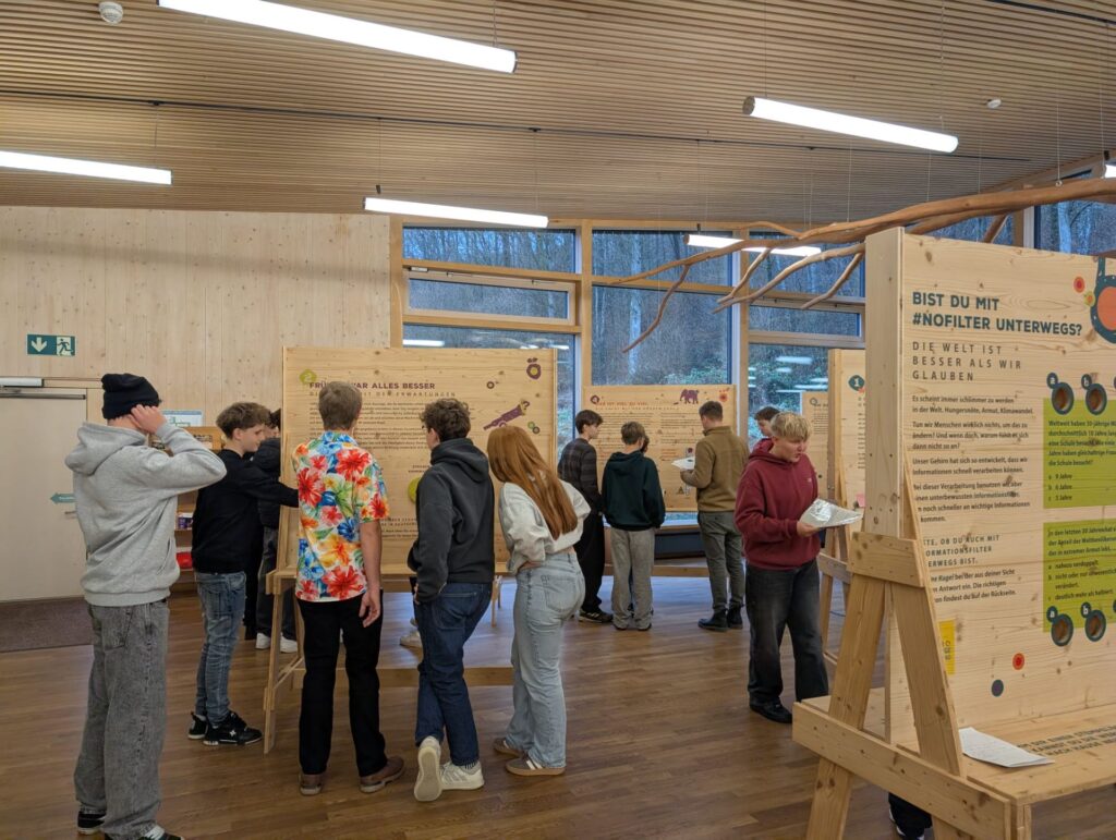 In der Ausstellung #NoFilter erfuhren die Schülerinnen und Schüler, wie leicht unser Gehirn Informationen verzerrt. An verschiedenen Mitmachstationen zu Themen wie Vorurteile, großen Zahlen oder dramatische Schlagzeilen lernten sie, negative Informationsfilter zu erkennen und kritisch zu hinterfragen.